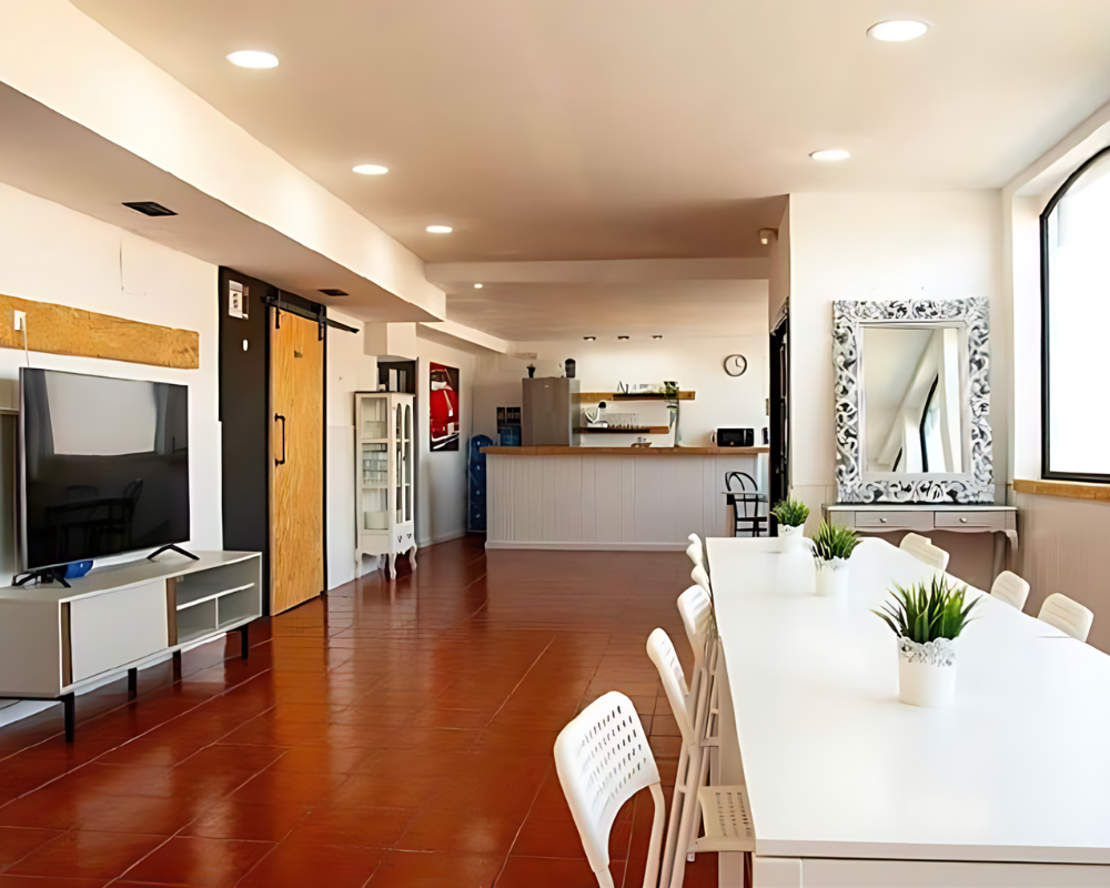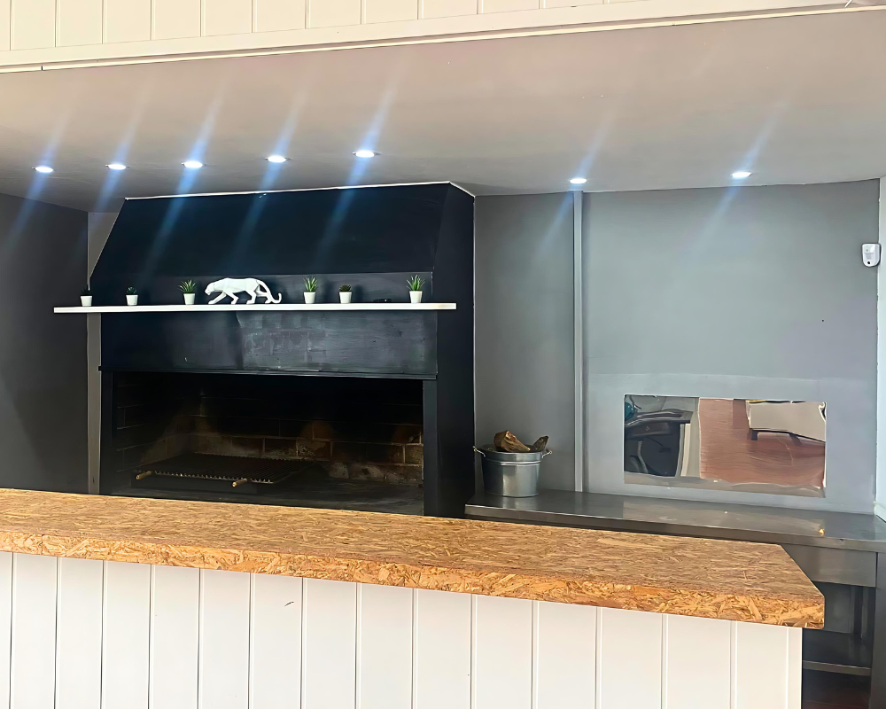 EL HALL es la zona de acceso y recepción, aquí encontrará una amplia sala con barra de bar, mesas, sillas, acceso a los baños y la zona donde está ubicada la pantalla de TV. Desde aquí también accedemos a la zona de parrilla y a la sala de juegos. Todas las comodidades para que no falte de nada y puedas disfrutar del espacio con los tuyos.