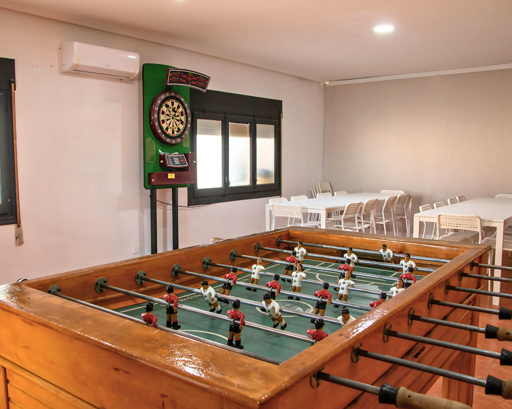 La sala de juegos dispone de un amplio espacio interior . Relájate en los sofás de la zona zona chill out, y diviértete retando a todos al futbolín y a los dardos.